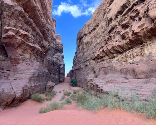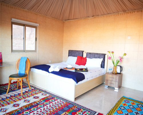 Our camp is nestled in Wadi Rum’s protected area, close to Khazali Mountain, offering an authentic yet elevated Bedouin experience. The private tent is designed for 1-2 guests, ensuring an exclusive and intimate stay. Enjoy the convenience of a modern private toilet, adding a touch of luxury to your desert adventure. We provide complimentary pickup and drop-off from Wadi Rum Village for a seamless journey. Start your day with a traditional Bedouin breakfast and enjoy the warm hospitality of the Saleh family, all while surrounded by the breathtaking orange and red sands of Wadi Rum.